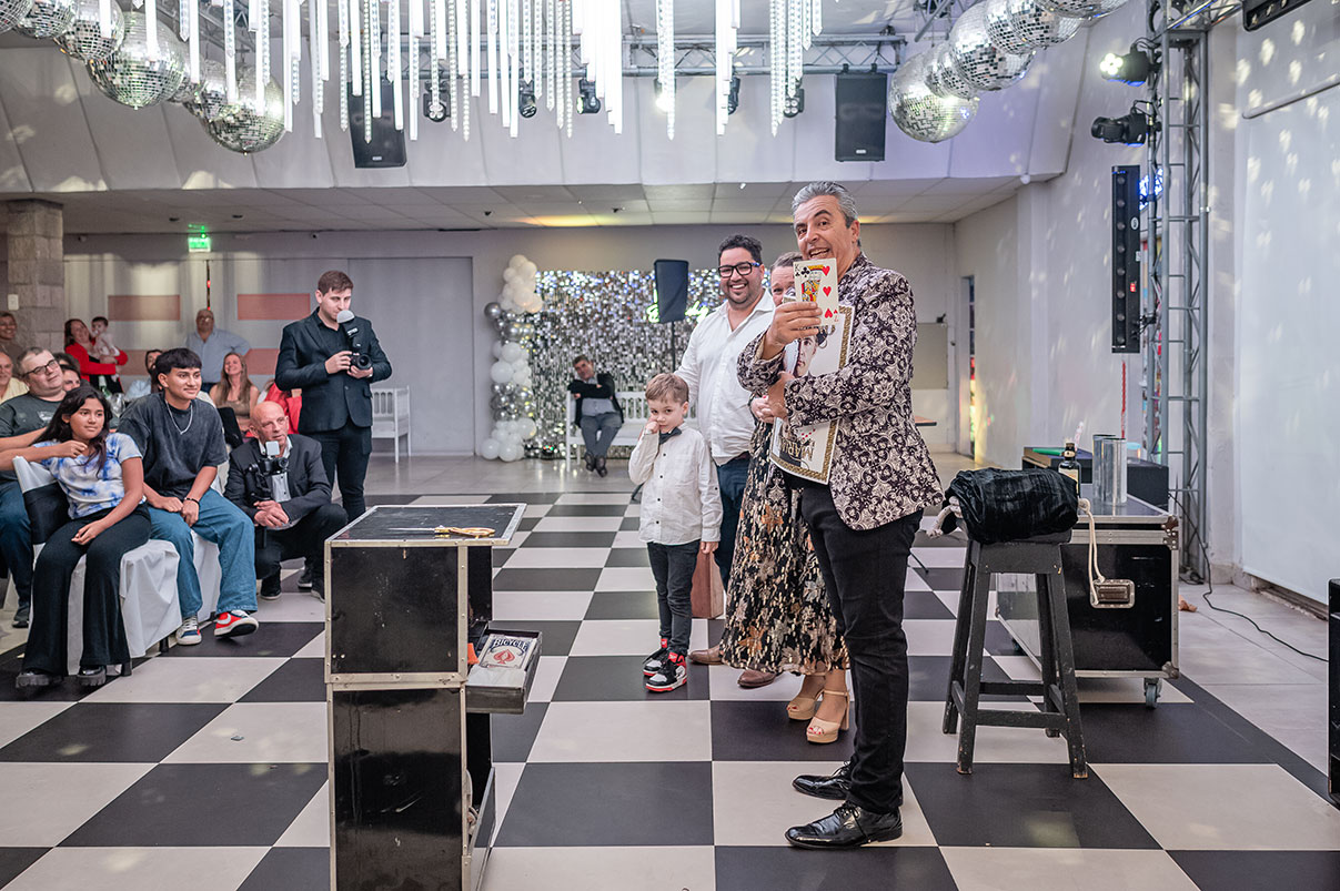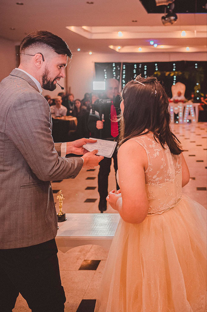 Conducción + coordinación de la fiesta donde el animador va resaltando los momentos mas importantes del evento (ingreso del/la agasajada/o , vals, torta,brindis, sorteos, sorpresas especiales) + 🎲 JUEGOS PARTICIPATIVOS + ⭐ ANIMACIÓN de las tandas de baile